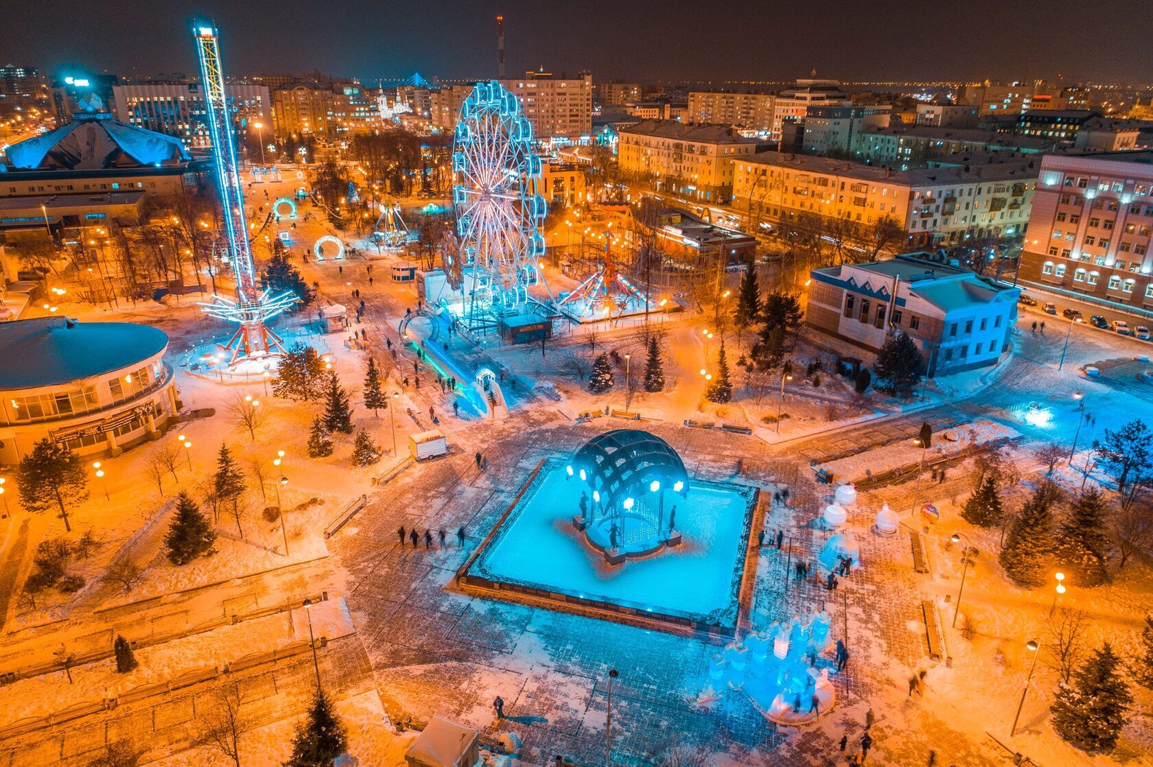 Пешеходная зона длиной 800 метров идеальна для времяпрепровождения с самыми близкими людьми. Здесь можно прокатиться на коньках по сияющему льду, а после рассмотреть удивительные фигуры изо льда, в которых отражается свет ярких фонарей.